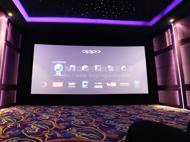 結合前墻寬度以及兩排沙發觀影距離的觀影舒適度,設計之初考慮了200寸2.35:1的寬熒幕,這也是好萊塢電影的拍攝比列標準,同樣為了消除環境的光污染,四個墻面做的都是深顏色的透聲布修飾,頂面星空頂吸光設計,尤其是吸頂的揚聲器都按照磨砂黑定制,投影選擇了jvs的的n8,經過isf專業視頻調后,黑位深沉,亮部飽滿色彩準確