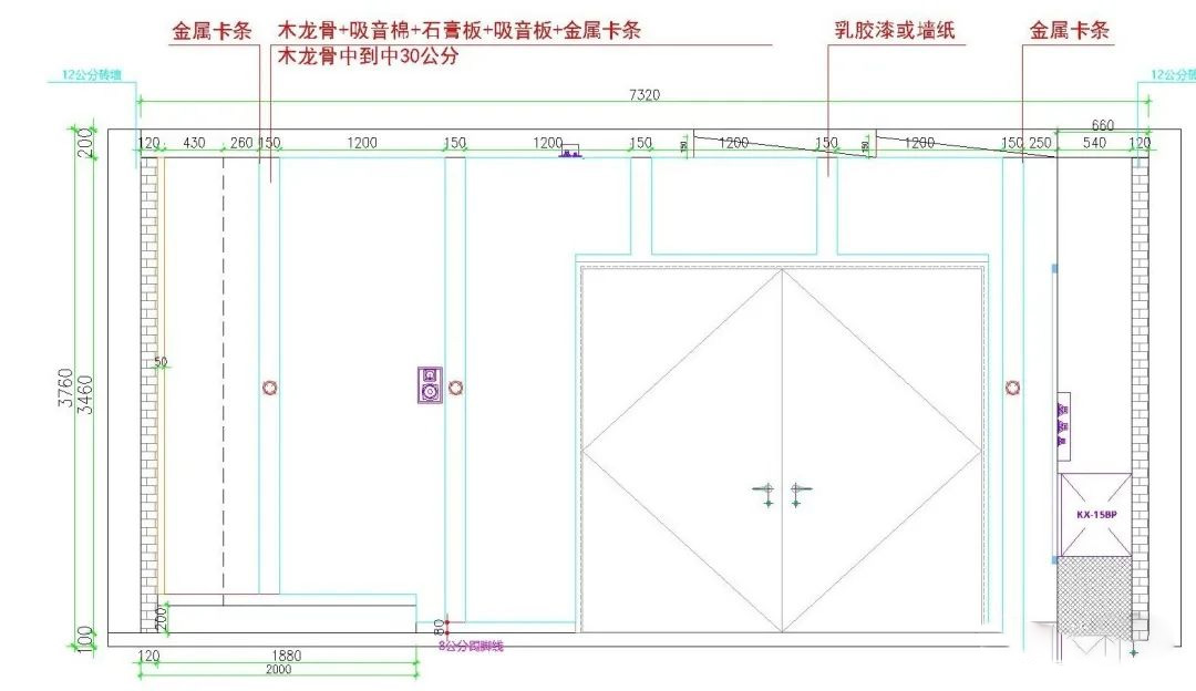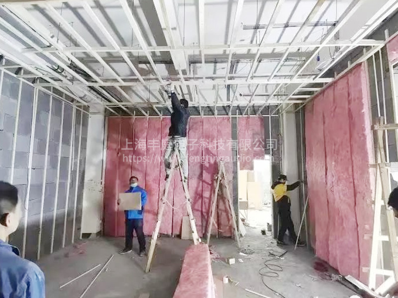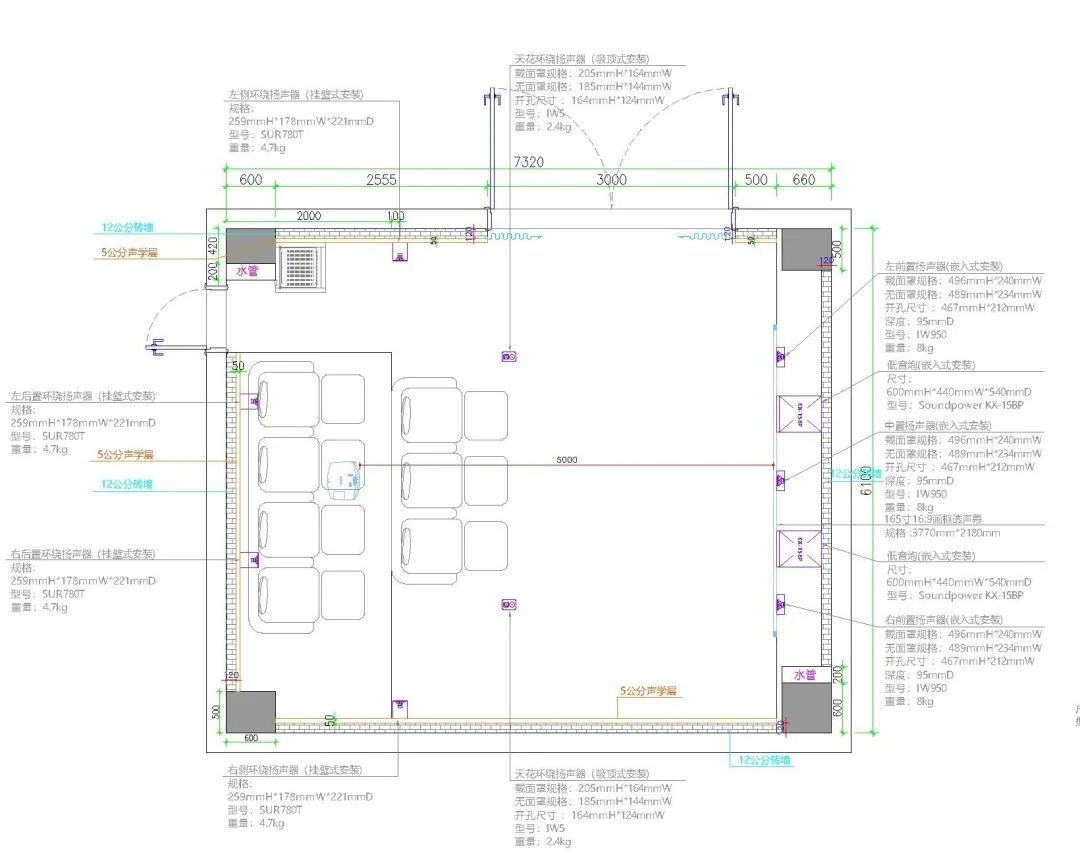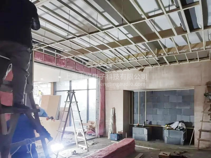 在對于裝修設計時兩面都是純玻璃,在隔音這一塊我們增加了難題,為了滿足隔音要求,我們采用了不同介質的材料,外面是玻璃,然后在玻璃外加了厚密度的隔音棉,整體做了一層隔音板,隔音板外敷了一層隔音氈,然后是一堵實墻,實墻外是龍骨、吸音棉加聚酯纖維吸音板。 影院我們按照杜比全景聲7.2.2能做整體規劃的。