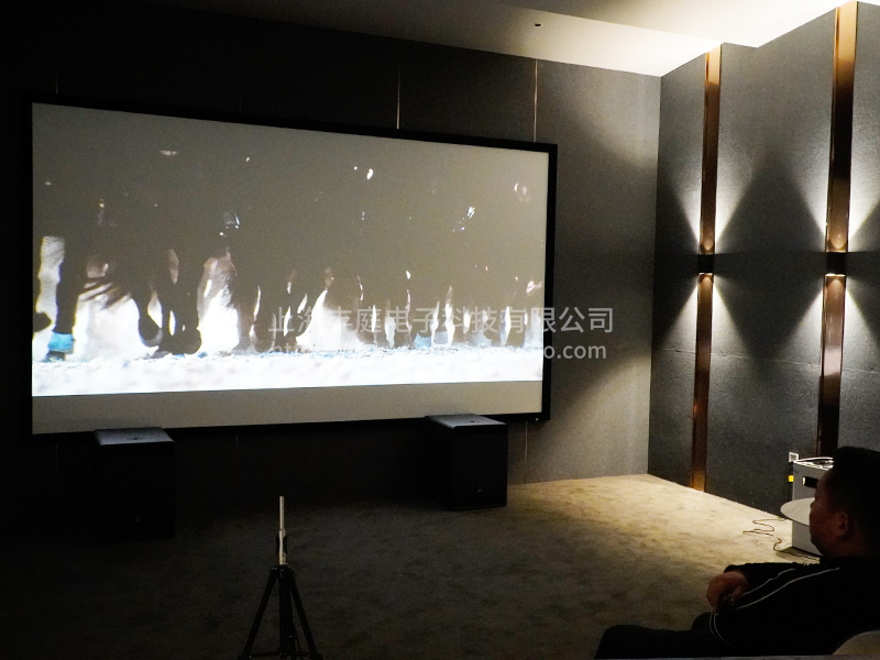 現場搭配的是165寸透視幕設計,由于幕布較大,考慮到畫面的實際效果,投影機我們采用的是優派激光光源投影機,影音室的整體色系都以灰色為主。