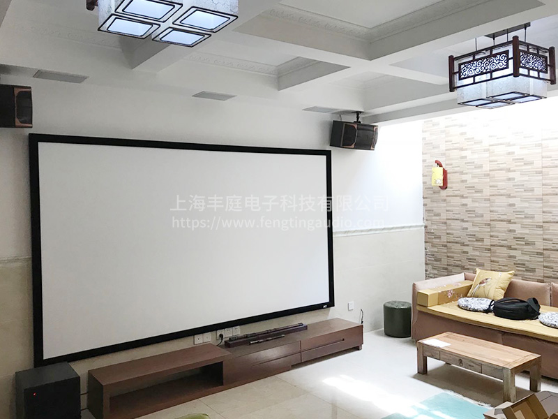 功能上考慮影院與卡拉OK,為了滿足整體效果與簡潔性,前墻做了50公分聲學墻設計,內側四周實填充吸音棉,在滿足前墻強吸音的基礎上,也是一道強有力的低頻陷阱,同時為了揚聲器的指向性更集中,結構造型上左右主聲道也做了一定傾斜設計。